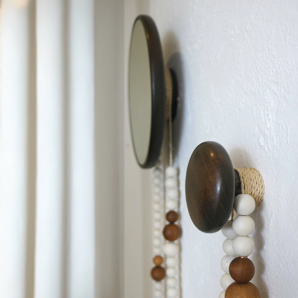 Acompanha 02 suporte de madeira ebanizada: 1 espelho de 30cm e outro de 12cm;